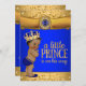 Invitation baby shower Prince avec adorable bébé afro-américain d'origine portant une belle couronne bleue et or et le bleu royal et l'or tenue sur un beau arrière - plan de bijoux de parties scintillant bleu et or royal. Ces élégantes invitations royales à la douche pour bébé bleu et or prince sont facilement customisées pour votre événement en ajoutant simplement vos détails dans le style de police et le libellé de votre choix. Il s'agit d'un design imprimé sans véritable parties scintillant, bijoux, feuille, etc.