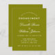 Une simple invitation à une partie de fiançailles. Il n'a que du texte blanc sur vert olive. Les noms sont écrits dans un élégant script calligraphique, le reste en casquette. la première ligne est le texte voûté.
