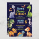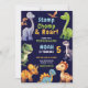 Une invitation à l'anniversaire de dinosaure est un invitation de fête à thème avec des graphismes amusants de dinosaures, des couleurs audacieuses et des textes ludiques comme "Stomp, Chomp, et Roar!" Les dessins populaires sont composés de dinosaures de dessins animés, d'arrière - plans d'inspiration fossile ou de paysages de jungle. Parfaits pour les enfants qui aiment les dinosaures, ils donnent le ton d'une fête préhistorique sur le thème de l'aventure !