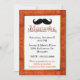 Amusante invitation à la fête d'Halloween sur le thème de la moustache. Graphiques d'un arrière - plan orange d'aspect ancien, avec une zone de texte blanc bordée d'une couleur or, au centre. Une moustache de style dessin animé, le guidon noir, orne le sommet de l'invitation. Le texte en orange et noir est prêt à être personnalisé pour votre fête.