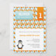 Une Invitation de partie de pingouin moderne avec une illustration de pingouin et un arrière - plan géométrique coloré. Parfait pour un anniversaire d'enfant ou une fête d'hiver.