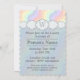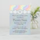 Cette invitation comprend des lignes de vagues qui font un motif simple et amusant dans un arc-en-ciel de couleurs pastel allant du rose à la lavande surplombé d'une couche semi-transparente de pluie sous un ensemble de nuages gris moelleux. Le nuage central contient un monogramme au-dessus de la section pluie sur la partie inférieure de la carte où vous pouvez trouver un exemple de texte qui peut être customisé pour créer un invitation personnalisé pour votre événement.