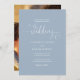 Cette élégante invitation de mariage peut être personnalisée avec vos détails de célébration mis en typographie chic sur un arrière - plan bleu poussiéreux et votre photo spéciale au verso. Conçu par Thisisnotme©