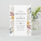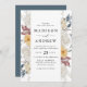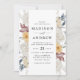 Elégante faire-part de mariage fleurie avec ses détails mariages encadrés de fleurs sauvages aquarellés dans des tons bleu poussiéreux, bordeaux, mauve, jaune doré et crème. Le faire-part de mariage fleur sauvage s'inverse pour afficher une couleur bleu foncé solide.