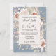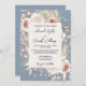 Cette Faire-part de mariage florale Dusty Blue Rustic est tendance dans une palette de couleurs douces champagne et ivoire de la terre sur un arrière - plan bleu poussiéreux. Il présente de beaux roses et floraux en ivoire et blouis détaillés avec des palmiers séchés et de la verdure d'eucalyptus aux accents faux or. Cette belle palette de couleurs est parfaite pour un printemps, été ou mariage de automne. Personnalisez avec tous vos détails mariages.