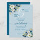 Une élégante invitation de mariage avec des fleurs de parties scintillant bleu et or poussiéreux et une calligraphie élégante que vous pouvez customiser avec vos détails.