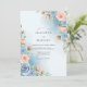 Soft watercolor washes in misty blue create an ethereal atmosphere for this romantic design. Delicate clusters of peach roses and sky blue blossoms are thoughtfully arranged with sage green foliage. The painterly style evokes a serene feeling, perfect for an elegant spring or summer wedding.
