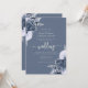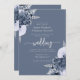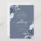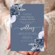 Cette élégante invitation à un mariage présente des bouquets de fleurs bleues poussiéreuses, agrémentés d'une végétation en faux feuille d'argent dans deux coins, sur un arrière - plan bleu poussiéreux. Le texte personnalisable combine des polices sérif gris argenté, italique et écriture manuscrite. Le design floral bleu et argent poussiéreux est répété à l'envers.