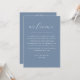 This elegant minimalist dusty blue wedding weekend card is a perfect choice for couples planning a nautical, spring, or summer wedding. The soft, tranquil dusty blue shade complements coastal and beach themed weddings beautifully. It features a thoughtfully designed wedding itinerary, outlining the events from the rehearsal dinner to the ceremony, reception, and morning after brunch. The heartfelt welcome message expresses your gratitude to guests, making it a cherished keepsake. Ideal for nautical, beach, and garden themed weddings, this card will add a touch of elegance and charm to your wedding details, while keeping your guests informed and excited about the celebrations. Available as both a printed card and a digital download.