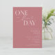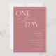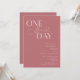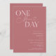 Dîner de répétition minimaliste mariage avec un texte de typographie qui dit "un jour de plus". L'arrière - plan est rose poussiéreux.