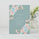 This design features a serene dusty teal background adorned with soft pink cherry blossoms and light blue roses. The watercolor aesthetic creates a romantic and airy mood perfect for a springtime theme. Elegant sage green leaves weave through the floral clusters, adding a touch of nature-inspired beauty.