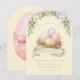 Invite your Friends and family over for a special Easter egg hunt with this beautiful invitation. This Easter invitation has a nest with Easter eggs adorned with flowers. Colors used include olive green, cream, blush pink, purple and brown. There is a pink Easter egg with a bow on the back. All text is editable to meet the needs of your event.