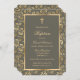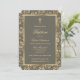 Élégantes invitations au baptême d'ébène et de fleurs d'or avec une croix d'or à l'intérieur d'un cadre fleuri.