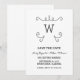 Monogramme Whimsical Flourish moderne et simple Enregistrer la date Invitation avec un élégant motif tourbillon en noir. Facile à customiser, il suffit d'ajouter vos informations initiales et mariages dans les champs de texte fournis. Cliquez sur "Customiser" pour trouver d'autres options de personnalisation.