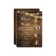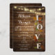 Echelle en bois vintage aux lettres LOVE décorée de feuilles en chêne d'automne aux couleurs chaudes de l'automne sur cette suite rustique de faire-part de mariage. Les lampes à cordes scintillantes Sparkley ajoutent un charme supplémentaire à l'arrière - plan en bois de grange foncé.