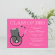 Invitations de Faire-part de diplôme d'études Médicales roses. Illustration stéthoscope et porte - bloc sur un arrière - plan rose. Parfait pour un diplôme d'études collégiales, un diplôme d'études de sciences infirmières ou un diplôme d'études de médecine !