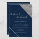 Calligraphie classique élégante en argent avec parties scintillant géométrique en argent et invitation à mariage bleu marine
