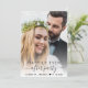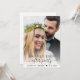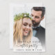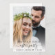 Faire-part de mariage intime ou d'élopement élégant et invitation à une réception pour informer la famille et les amis que vous vous êtes mariés lors d'une petite cérémonie de mariage intime, et les inviter maintenant à une réception de mariage. Le recto présente votre photo de mariage superposée avec "Fête de Pour Toujours Heureux" dans un mélange de typographie simple et d'un script tendance avec fioritures. Sous votre photo, ajoutez vos prénoms et la date du mariage. Au verso, personnalisez votre message avec plus de détails et ajoutez les détails de la fête ou de la réception et vos noms dans un script ressemblant à une signature.