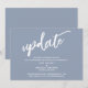 La particularité de cette suite est due à la police de caractères moderne et manuscrite utilisée pour les phrases d'accentuation. Dans le cas où vous auriez besoin de faire savoir à vos invités que votre mariage a été annulé, cette carte propose une option audacieuse et accrocheuse. Dans ce modèle, la police de caractères manuscrite a été utilisée pour créer un graphique simple représentant le mot "mise à jour". Utilisez les champs du modèle pour ajouter vos informations personnelles et faire de ce design unique et moderne votre propre création. Le fond uni peut être changé en n'importe quelle couleur de votre choix. N'hésitez pas à nous contacter pour toute demande spéciale ou pour une aide à la personnalisation. // 100 //