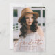 Invitez vos invités à célébrer la remise de diplôme avec nos invitations de fin d'études en photo élégantes. Les invitations de fin d'études présentent la photo verticale du diplômé avec "Diplômé" dans une police de calligraphie moderne marron terracotta en surimpression. Personnalisez le devant de l'invitation de fin d'études moderne en ajoutant le nom du diplômé, le nom de l'école et l'année de fin d'études. L'invitation se retourne pour afficher les détails de votre fête de fin d'études et un motif géométrique tendance marron et blanc à pois.