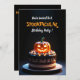 Célébrez dans un style hantant avec cette éffrayante invitation d'anniversaire d'Halloween avec un arrière - plan noir dramatique, la typographie blanche et orange, et une illustration festive de gâteau citrouille. Personnalisez le texte avec le nom et l’âge de votre enfant pour créer un invitation unique. Parfait pour les anniversaires d'octobre, les fêtes costumées ou toute fête d'Halloween. Imprimé sur des cartons de qualité supérieure avec des options avant et arrière en couleur.