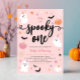 Éffrayant une rose Halloween mignon fantôme 1er anniversaire invitation fête. Design moderne sur le thème de l'Halloween pour une fête éffrayante ! Cette invitation d'anniversaire présente des toiles d'araignée, des fantômes, des citrouilles, des chauves-souris, des araignées, des feuilles, des cornes, des étoiles et des marguerites. Cet invitation est parfait pour les petites filles !