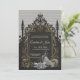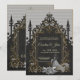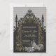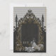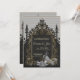 Elégance en argent et noir. Cette image présente une illustration en noir et blanc d'un cadre mariage aux motifs en or et en argent complexes. Le cadre est orné de motifs floraux ornés et d'une arcade centrale. Une mariée en robe flottante, tenant un bouquet, se tient dans le cadre, face à l'extérieur du spectateur. L'arrière - plan est une surface noire texturée, créant une atmosphère dramatique et élégante.