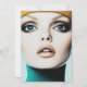 Un portrait en gros plan d'un modèle aux yeux turquoises captivants, accentué par un maquillage des yeux audacieux et des lèvres pleines de tons neutres. Le style vintage et les couleurs riches évoquent l'essence de la mode des années 60, avec une touche d'art moderne. Son regard intense et son expression douce captent l'attrait et le raffinement de l'époque.