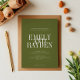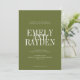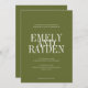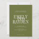 Le faire-part de mariage présente un design minimaliste avec un arrière - plan vert olive et un agencement propre et symétrique. Il utilise d'élégantes polices serif, avec les noms du couple clairement affichés dans un grand texte qui se chevauchent pour une touche audacieuse et moderne. Les autres détails sont disposés dans une police plus petite et claire, tout en conservant simplicité et sophistication, mêlant esthétique contemporaine et traditionnelle.