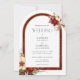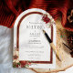 Ce design romantique et classique comprend des grappes de fleurs d'hiver rouges et blanches, des pins, des baies sèches et des brindilles rustiques personnalisées, des graphiques modernes et des champs de texte modifiables entourés d'une bordure rouge damassée riche avec des bords dorés.
