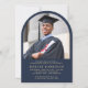 Faire-part classique en arc de cercle pour l'obtention du diplôme universitaire et l'invitation de la fête avec un casquette de grade d'or, le nom et l'année de classe du diplômé dans un élégant script d'or, et leur école, majeure et honneurs. Au verso, ajoutez une photo et personnalisez les détails de votre fête.