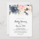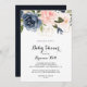 Cet élégant baby shower de calligraphie florale hivernale est parfait pour un baby shower moderne. Le design présente de belles peintes à la main bleu foncé, bleu, bleu marine, rose, rousse, fleurs d'or et feuillage vert, entassés dans d'élégants bouquets.