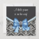 Elégant bébé bleu avec damas noir et bleu arc bébé garçon prince baby shower invitation modèle. Cette adorable invitation de baby shower damassé bleu et noir est facilement customisée pour votre événement en choisissant simplement le bouton "Customisez!" pour commencer à ajouter les détails de votre événement, le style de police, la taille et la couleur de la police et le libellé. Veuillez noter que tous les modèles d'invitation que vous trouverez sur Zazzle sont des graphiques imprimés sans bijoux, arcs, surélevés, gaufrés, ou des pièces ou pièces ajoutées.