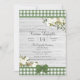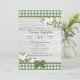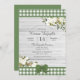 Elégante décoration fleurie et en vichy sur un arrière - plan en bois blanc pour une soirée champêtre, rustique ou chic et dépaysante. Customisez cette invitation baby shower avec vos propres nom, adresse, date et registre.
