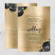 This elegant wedding invitation features black floral bouquets set off with gold faux foil greenery in two corners, on a background image of gold brushed metal. The customizable black text combines serif, italic and handwriting fonts. The reverse side features a matching black and gold floral and gold brushed metal design.
