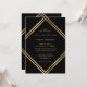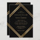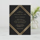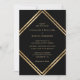 Elegant black and gold wedding invitation featuring wedding details inside a gold geometric frame.