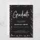Elegant black script typography nurse graduation invitation with a pattern of medical instruments. Illustrated and designed by Patricia Alvarez.