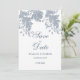 Un élégant élégant blanc et bleu mauve dentelle florale mariage Enregistrer la date invitation. Cette faire-part de mariage aux couleurs pastel minimalistes est parfaite pour toute jeune fille raffinée. Ce design est idéal pour un événement mariage branché et élégant. Customisez cette conception avec votre message et des informations personnalisées. Tous les dessins sont imprimés.