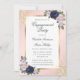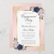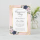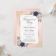 Elégante invitation à la fête de fiançailles bleu marine et rousse avec des fleurs bleues et roses rousses encadrant les détails de l'événement. Éléments correspondants disponibles.