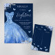Cette élégante invitation à 18e anniversaire a été conçue pour célébrer le jalon spécial d'une célébrante de 18 ans. Associant style contemporain et sophistication intemporelle, cette invitation est un choix parfait pour marquer cette occasion importante. La mise en page éditable de dix-huit scripts permet la personnalisation, vous permettant d'ajouter votre touche unique et de customiser l'invitation à votre goût. Les fleurs et les accents papillons apportent une touche de beauté et de grâce naturelles, donnant le ton d'une célébration vraiment mémorable. Que vous soyez à la recherche d'idées de fête pour un debutante ou pour la planification d'un 15ème quinceanera ou d'un doux 16 anniversaire, cette invitation est polyvalente et pratique. Il peut être customisé et personnalisé pour convenir à différentes occasions, ce qui en fait une option flexible. Avec son design captivant de robe de parties scintillant bleu clair et argent et l'option de changer l'arrière - plan bleu foncé, cette invitation exhale l'élégance et le charme. Les tons bleus créent un contraste visuellement époustouflant qui laissera une impression durable à vos invités. N'oubliez pas d'incorporer le programme des 18 roses et 18 bougies au dos de cette invitation. C'est une tradition chère qui ajoute une couche supplémentaire de signification à la célébration. Cette invitation complète parfaitement le rituel, assurant ainsi un événement cohésif et élégant. Choisissez cette élégante invitation à 18e anniversaire et laissez les festivités commencer!