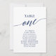 Ces élégantes cartes marines bleu de table numéro 1 sont parfaites pour un mariage simple. Le design neutre présente une carte minimaliste décorée de typographie romantique et fantaisiste. La carte s'imprime à l'avant et à l'arrière (double face).