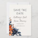 Il s'agit d'un élégant mariage bleu marine et orange brûlé avec fleurs d'aquarelle roses bleues et orange Save the Date faire-part de mariage avec un design arrière - plan orange clair. Il est parfait pour une fête mariage de automne.