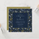 Une élégante faire-part de mariage dramatique présente un arrière - plan bleu marine avec un motif d'argent et d'or botanique. Personnalisez vos détails importants dans une typographie argentée moderne. L'envers est coordonné en or.