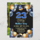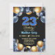 An elegant modern design featuring blue 23 number with gold edges and balloons with silver, blue and gold glitter and a special photo of the birthday person on the back of the invitation. Customize the details for a unique and chic Birthday Celebration.