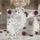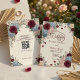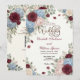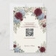 Elevate your contemporary ceremony with this sophisticated dark maroon floral layout, featuring seamless smartphone integration and striking red blooms.This layout utilizes a high-contrast aesthetic featuring deep maroon and dark crimson floral illustrations framing a crisp, off-white background. The visual hierarchy pairs classic serif typography with clean, contemporary sans-serif fonts, intentionally guiding the eye to a centrally aligned, scannable matrix block for digital guest information. The composition gracefully balances sophisticated botanical artistry with tech-savvy functionality. This is a flat printed image with a faux painted watercolor effect, not actual raised material.