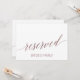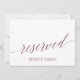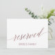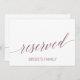 Ce signe de calligraphie en or rose élégant "réservé" est parfait pour un mariage simple. La carte est double face (imprimée des deux côtés). Le design rose pâle présente une carte minimaliste décorée d'une typographie romantique et fantaisiste en faux or rose. Utilisez ces cartes pour réserver des chaises ou des tables lors de votre cérémonie de mariage, réception ou tout événement.