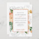 Cette faire-part de mariage fleurie romantique et élégante présente de la rouille, de la terre cuite, du champagne et des éléments floraux vintages blancs sur un script arrière - plan blanc et calligraphie, et est facile à customiser avec vos propres informations mariages.