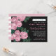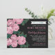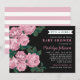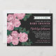 Les invitations élégantes à la douche bébé présentent une jolie illustration florale design de rose poussiéreux / mauve rose rose de jardin fleurs avec des feuilles verts riches contre un arrière - plan noir doux. Le texte personnalisé élégant peut être entièrement personnalisé pour l'événement spécial que vous planifiez. Un motif de larges bandes horizontales blanches contre un arrière - plan rose coordonnant habille le dos de la carte.