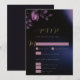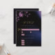 Une rose et quelques branches de feuilles d'eucalyptus, dessinées à la main au crayon de couleur et superposées de nuances de violet poussiéreux et foncé, font une carte de réponse de mariage moderne, sophistiquée, élégante et chic. Le fond noir et bleu foncé avec des touches de violet et de lumières illumine le ciel de minuit. L'élégant script de calligraphie, de la teinte de l'or, rend cette invitation noire et violette encore plus élégante.