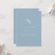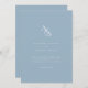 Élégant, classique, monogramme, bleu poudreux, faire-part de mariage. Invitation vos invités à votre journée spéciale avec une invitation qui combine élégance intemporelle et simplicité moderne. Notre faire-part de mariage minimaliste est dotée d'un monogramme subtil et classique qui complète à la fois les styles mariage traditionnels et contemporains. Cette conception polyvalente se fond sans effort avec n'importe quelle palette de couleurs, offrant des possibilités infinies de refléter votre personnalité et le style de votre mariage. Disponible en version imprimée de haute qualité ou en téléchargement numérique écologique, parfait pour ceux qui préfèrent une empreinte carbone plus petite. L'option numérique est non seulement durable, mais aussi idéale pour ceux qui apprécient la flexibilité et aiment personnaliser leurs invitations. Grâce à une fonction d'édition facile à utiliser, vous pouvez rapidement customiser vos initiales et d'autres détails importants pour rendre votre invitation vraiment unique. Que votre mariage soit classique ou moderne, cette invitation apportera une touche de beauté intemporelle et de style sobre à votre célébration.